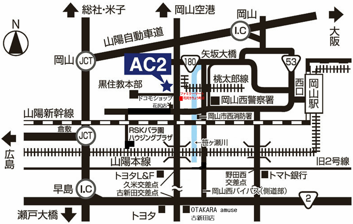岡山駅西口より車で約10分 ※山陽自動車道 岡山ICからは 国道180号線・矢坂大橋手前を左折し、 岡山西警察署の横を右折して下さい。