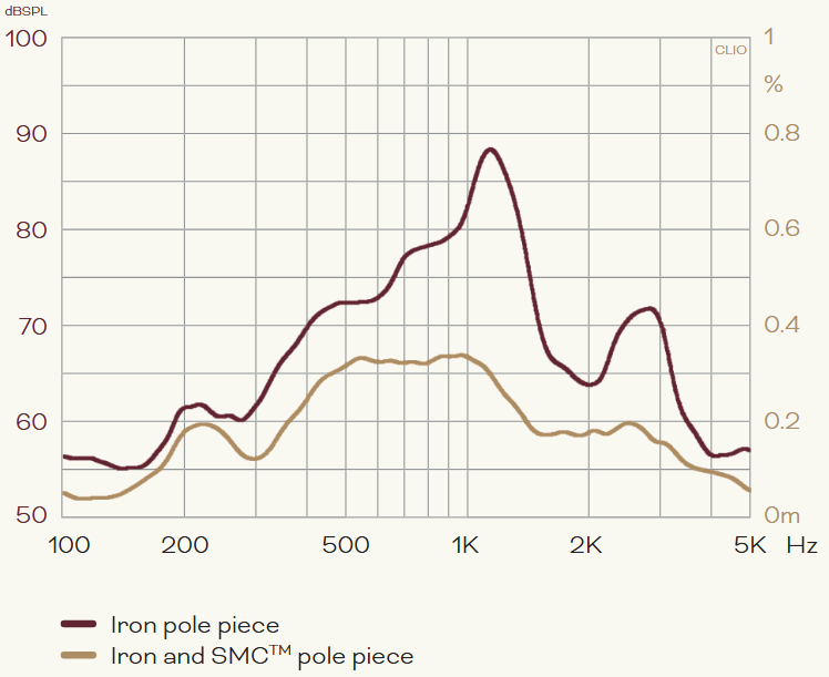 高調波歪みを低減する低い導電率の金属を、ユニットのポールピースに採用した