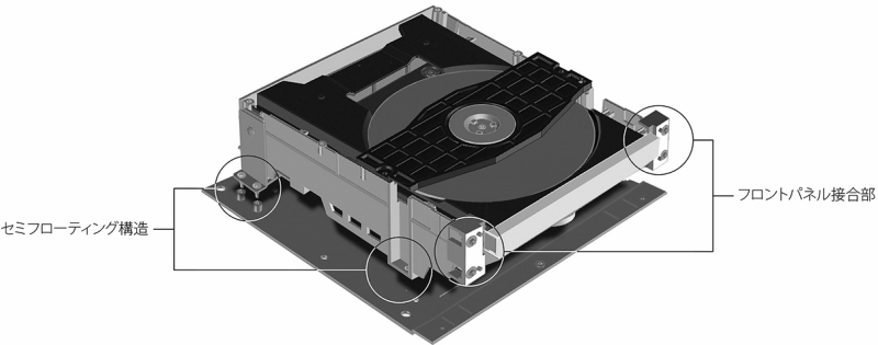 モーターの振動をメインシャーシから遮断することで、 シャーシ内での振動の共振を防ぎ、 同時に外部振動からCDメカニズムをアイソレート。 また、外部振動からもCDメカニズムをアイソレートすることで、 読み取り精度を向上させています。